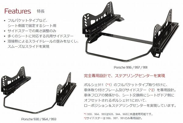 ポルシェ911のフルバケットタイプ取り付けに、車体取り付けフレーム及びサイドステーを専用設計。車体フロアの関係から、シート交換時にシートがドア側にオフセットされるポルシェ911において、ローポジション&ステアリングセンターを実現しています。
