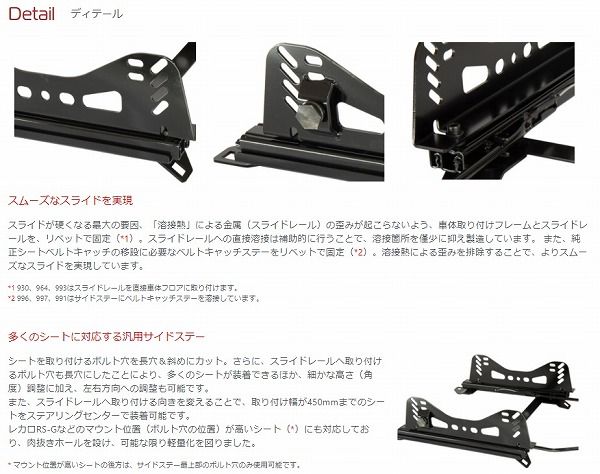 シートを取り付けるボルト穴を長穴&斜めにカット。さらに、スライドレールへ取り付けるボルト穴も長穴にしたことにより、多くのシートが装着できるほか、細かな高さ(角度)調整に加え、左右方向への調整も可能です。また、スライドレールへ取り付ける向きを変えることで、取り付け幅が450mmまでのシートをステアリングセンターで装着可能です。レカロRS-Gなどのマウント位置(ボルト穴の位置)が高いシートにも対応しており、肉抜きホールを設け、可能な限り軽量化を図りました。