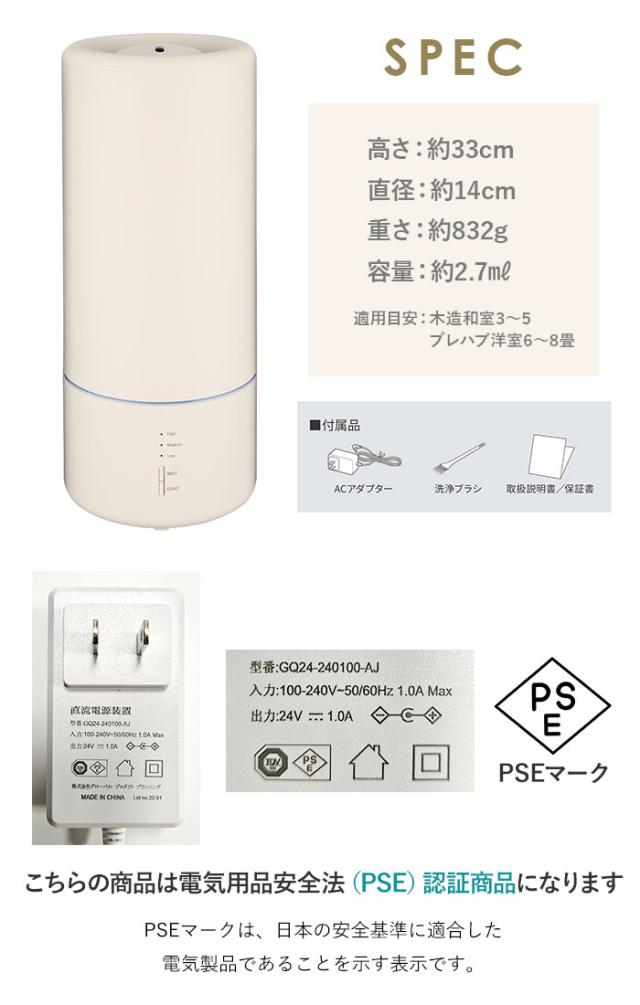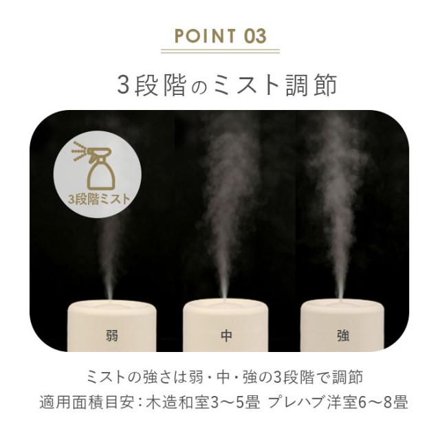 | 商品説明 | ・多機能よりも快機能を。必要な機能だけをハイレベルにこだわった、シンプルで洗練された超音波式アロマ加湿器 ・インテリアになじむ飽きのこないデザインとコンパクトなデザインは、使う人と場所を選ばない♪ ・タンク上部から直接注げるシンプル構造で簡単給水。 ・全部品がワンタッチで取り外し可能。シンプルな構造でお掃除も楽チン。 ・エッセンシャルオイルやアロマウォーターなどもタンクに直接入れて使用可能。 ・加湿しながら香りを楽しめる♪ ・給水1回で約10時間連続加湿。香りを長く手軽に楽しめるのが嬉しい♪(※加湿モードHighの場合。ご使用環境により加湿時間は異なります。) ・ミストの強さは好みで選べる3段階(強・中・弱)。 ・オフタイマー付き(2H・4H・6H)で、消し忘れの心配もない◎ ・タンクが外れたり水がなくなったら自動停止する安全設計◎ 4色のLEDライト(水色、黄緑、オレンジ、白)で様々な雰囲気を楽しめる♪ |
