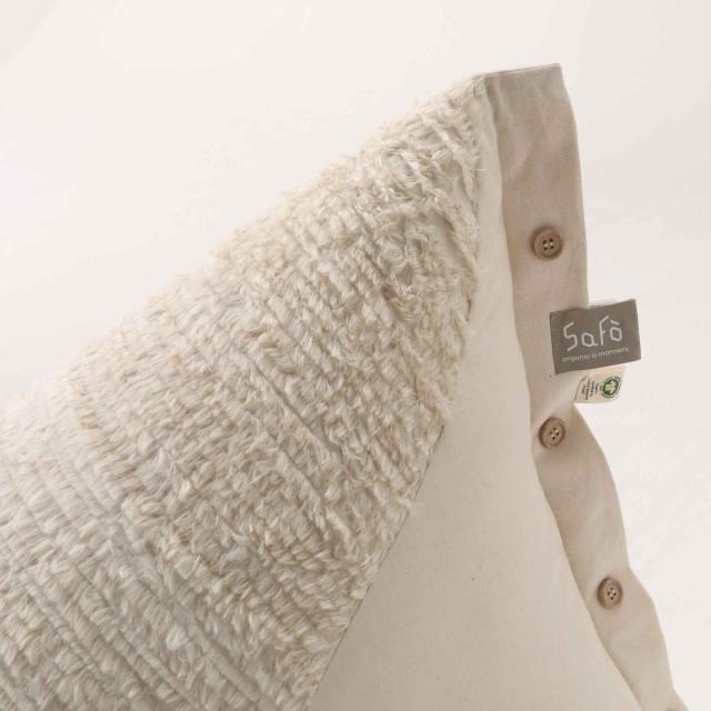 通常、生地の端の「耳」の部分は切り落とされ、そのまま破棄されていました。このような廃材をムダにせず製品に活かせないだろうか?SaFoの「Use it all (使い切る)」のコンセプトで生まれた新しい視点での製品開発が「コットン・ファー」として形になりました。中わた、側生地ともに国際認証を受けたオーガニックコットンです。