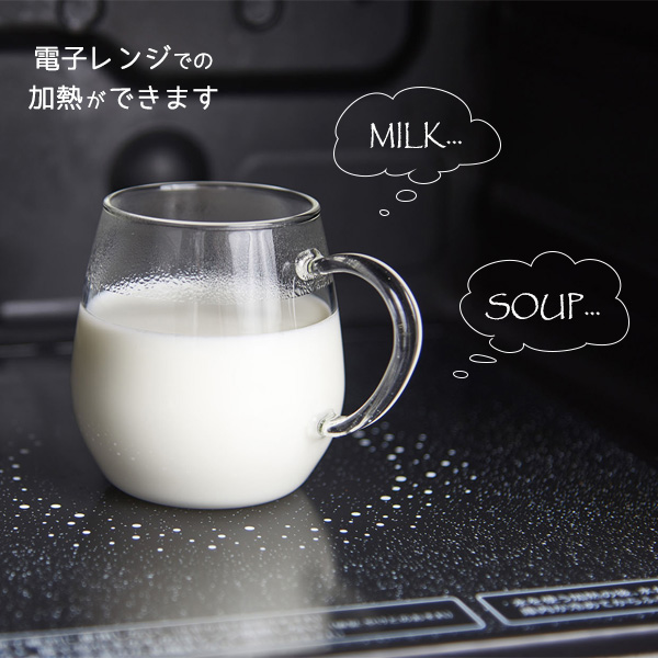 丸みの帯びたデザインが可愛らしい、耐熱ガラス製のラウンドマグ。