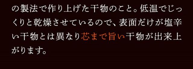 新鮮な銀鮭をシンプルに塩のみで味付けしており、熟成に時間をかけ、低温で3日間、じっくりと干し上げました。干し上げることで余分な水分が抜けて旨みが増し、脂質が濃縮。深みのあるおいしさになります。魚体の内部と表面近くの水分量の差が少ないので、味が均一に近い状態です。