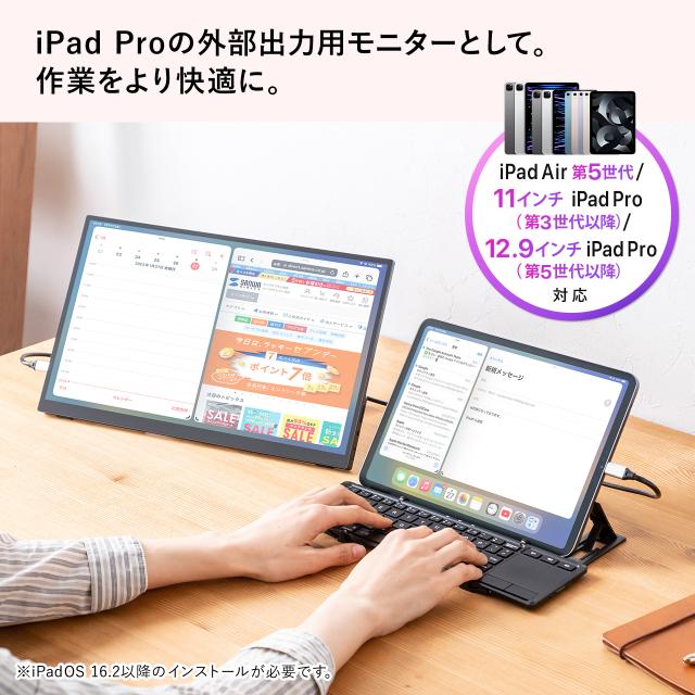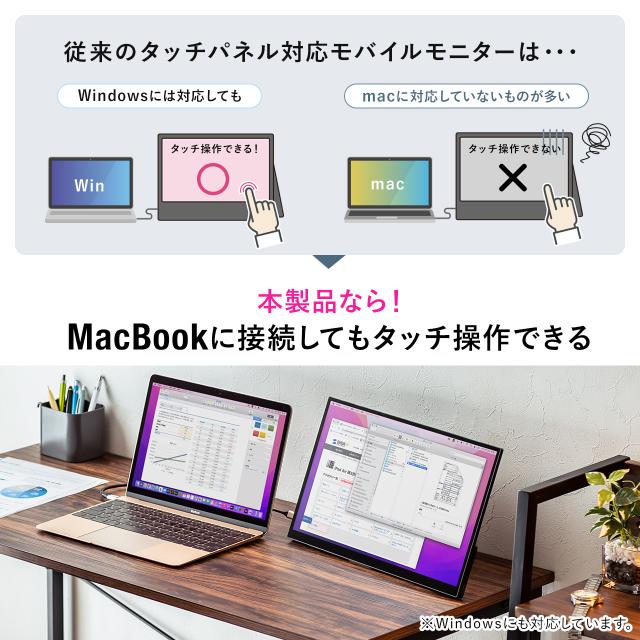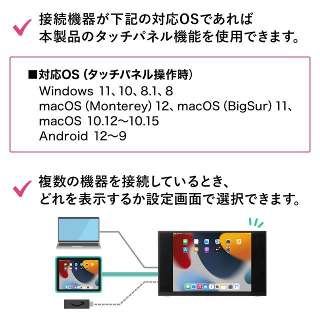 ●USB Type-Cケーブル一本で接続できる「DisplayPort Alt Mode」対応のモバイルモニターです。●WindowsやAndroidの他、mac OSでのタッチパネル操作にも対応しています。