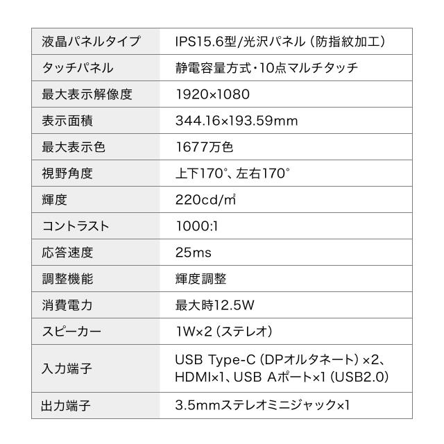 ⇒ご購入の前にご確認下さいmac OSやWindowsパソコンに接続して使用できる、Type-C接続のモバイルモニター。直感的に操作できる、10点マルチタッチに対応した15.6型モバイルモニター。スタンド機能、収納ケース付属。広い作業スペースを得られるフルHD解像度。テレワーク、モバイルワークでの作業のほか、Nintendo Switchなどゲーム機での使用にも最適。【WEB限定商品】