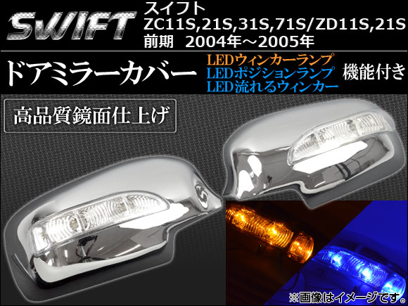 AP LEDウインカーランプ機能付き ドアミラーカバー AP-MRC-8409 入数:1セット(左右) スズキ スイフト ZC11S,21S,31S,71S/ZD11S,21S 前期 2004年11月〜2005年12月 鈴木 ZC11S ZD11S ZC21S ZD21S ZC31S ZC71S サイドミラーカバー ミラーカバー バックミラー リアビューミラーカバー スウィフト SWIFT LEDウィンカー LED 点灯 点滅 発光 流星 流れる ランプ ライト ドア ミラー カバー サイド ウインカー ウィンカー ポジションランプ ポジションライト メッキカバー クロームカバー メッキ シルバー 鏡面 エクステリア メッキパーツ 車用品 カー用品 外装パーツ 両面テープ automobile motorcar オートモービル モーターカー カー 車 自動車 車両