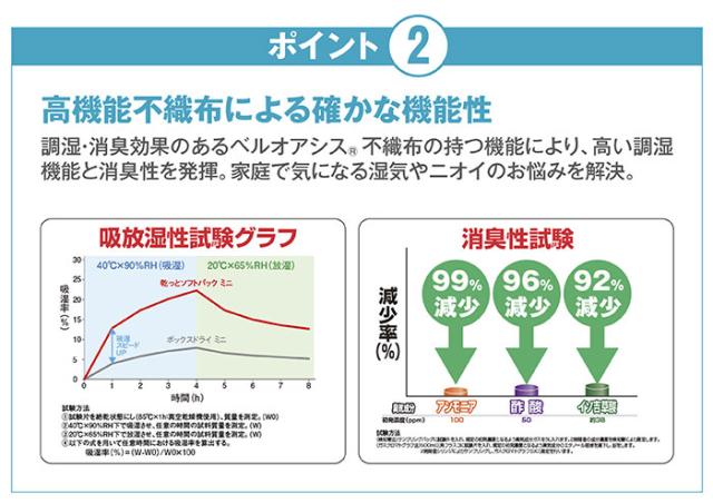 湿度に応じて吸放湿を繰り返すので、繰り返し使うことができて、経済的です。湿度を調整し、イヤなニオイを消臭します。