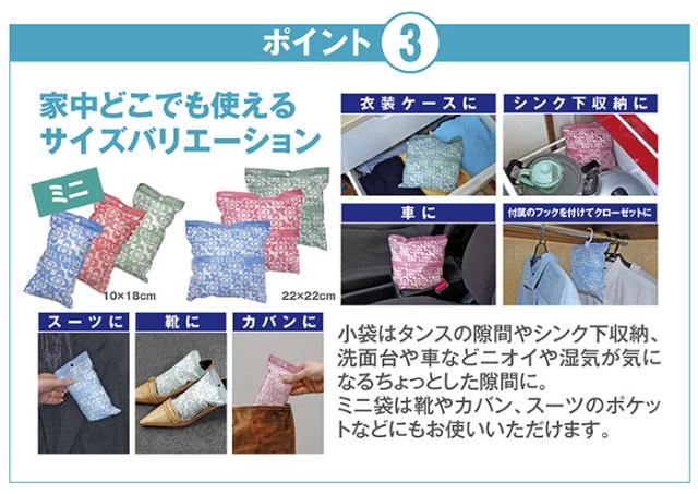 *靴やカバンはもちろん、タンスの隙間やシンクした収納・洗面台や車などニオイや湿度の気になる空間・隙間に入れるだけ!