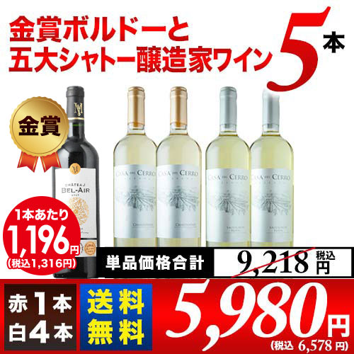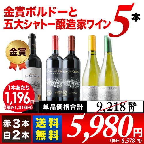 ワインセット 金賞ボルドーと五大シャトー醸造家ワイン5本セット(赤3本&白2本) 送料無料