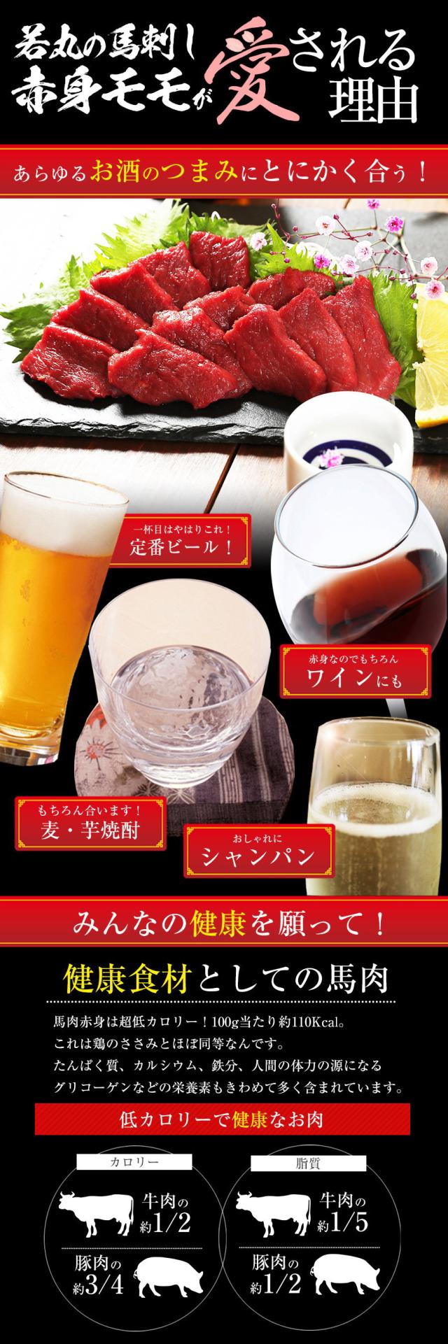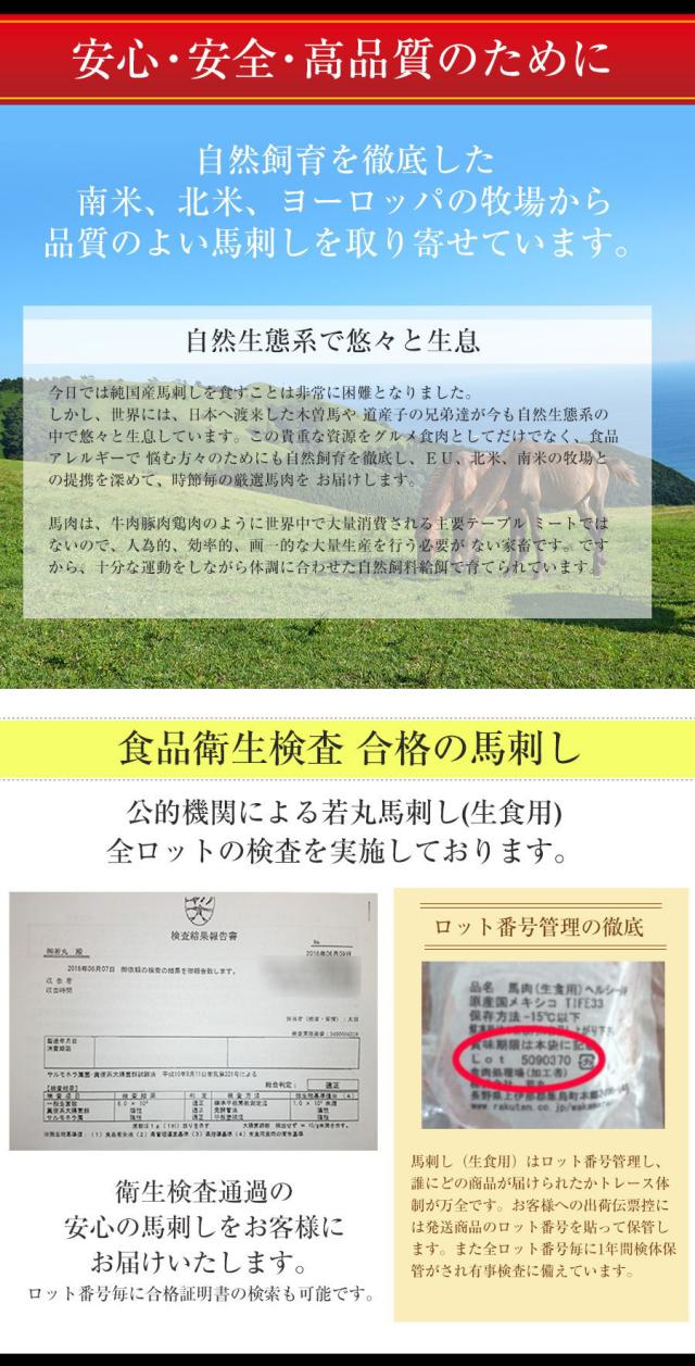 馬刺し専門若丸では、生食用商品全ロットについて公的検査機関で衛生検査を行い、生食用肉基準に適正である合格証明書が発行された商品だけを合格品としてお届けします。更にロット番号管理によるトレーサビリティーも可能で、お客様に届けられた商品に万全の管理を徹底しております。尚、お召し上がりの際は他の精肉、魚貝、野菜類と包丁やマナ板等を混同しないように十分な衛生的配慮をお願い致します。