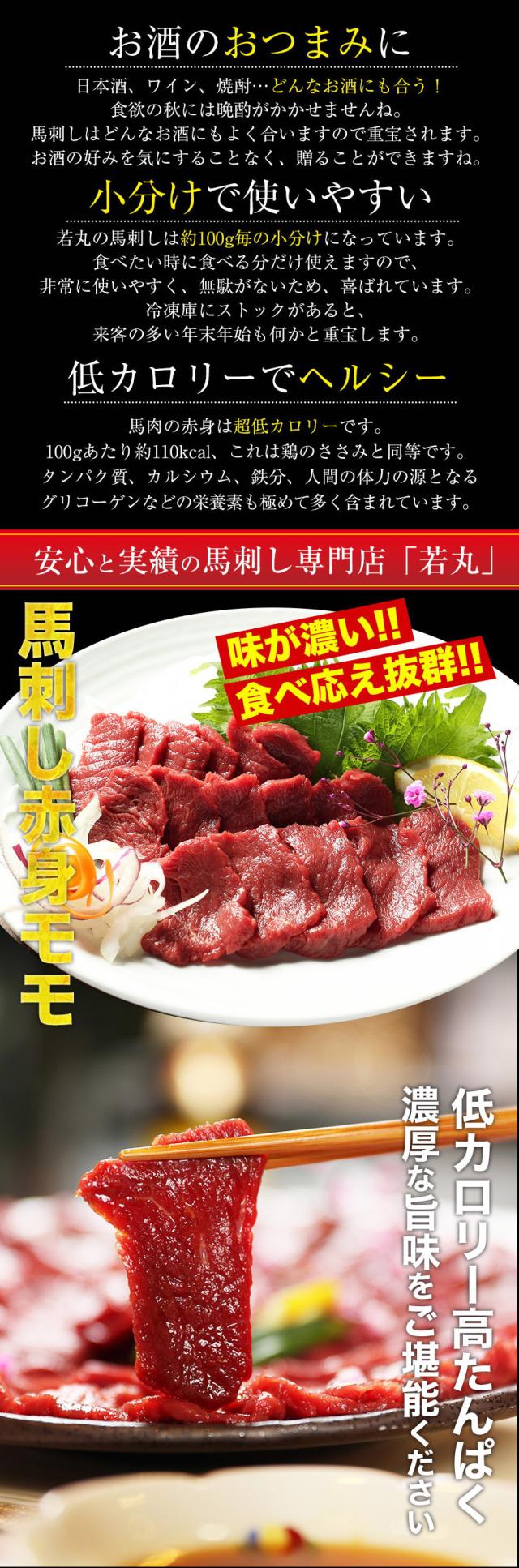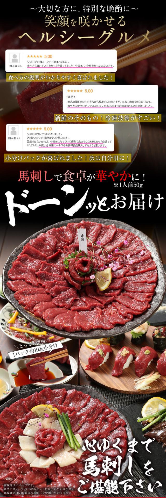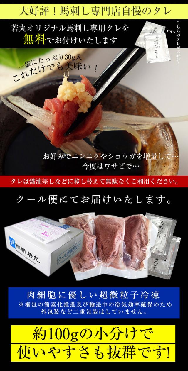 ★馬刺し1パックは約100g前後の食べきりサイズです。※ご注文は重量で量らせて頂いております。例)300gのご注文で馬刺し3ブロックとは限りません。2〜4ブロックとなる場合等もございます。予めご了承下さいませ。