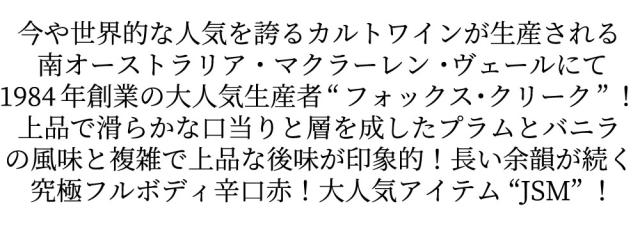 今や世界的な人気を誇るカルトワインが生産される南オーストラリア・マクラーレン・ヴェールにて1984年創業の大人気生産者“フォックス・クリーク”!上品で滑らかな口当りと層を成したプラムとバニラの風味と複雑で上品な後味が印象的!長い余韻が続く究極フルボディ辛口赤!大人気アイテム“JSM”!■さまざまなギフトアイテムをご用意しております。お中元 ギフト 御中元 お盆 お礼 敬老の日 クリスマス 冬ギフト お歳暮 御歳暮 お年賀 御年賀 お正月 年末年始 ご挨拶 バレンタイン ホワイトデー お返し 父の日 母の日 ギフト 贈答品 お土産 手土産 御祝 御礼 内祝い 引き出物 お祝い 結婚祝い 結婚内祝い 出産祝い 出産内祝い 引き菓子 快気祝い 快気内祝い 進学祝い 誕生日祝い バースデーケーキ プレゼント Wedding ウェディング ホームパーティ お花見 パーティ 退職ギフト 退職 就任祝い