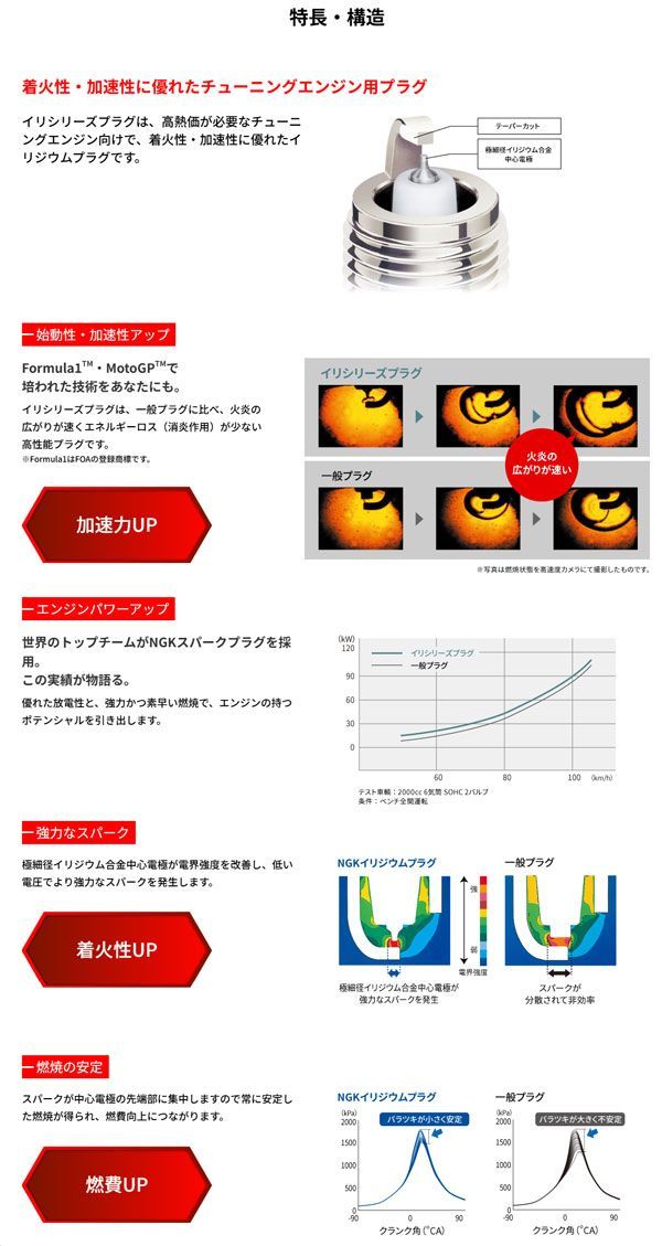 イリシリーズプラグは、高熱価が必要なチューニングエンジン向けで、着火性・加速性に優れたイリジウムプラグです。