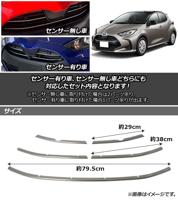 フロントグリルカバー トヨタ ヤリス KSP200系/MXP10系 センサー有り車,無し車両対応 2020年02月〜 鏡面シルバー ステンレス製 入数:1セット(5個) AP-FG438-SET