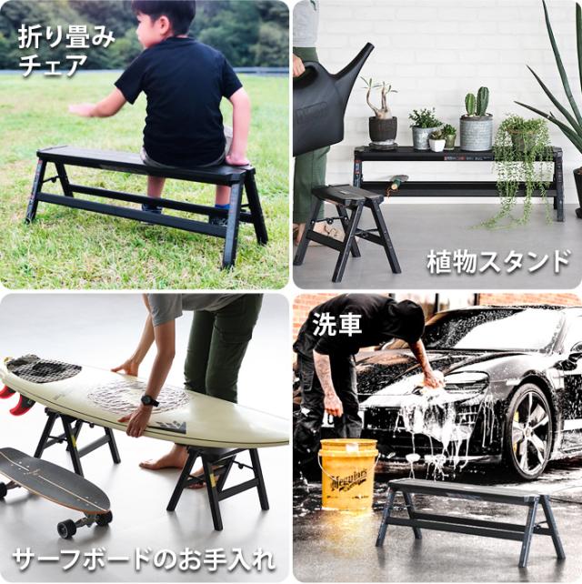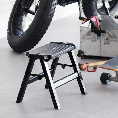 カッコよくて、使い勝手の良い脚立って意外とない…そんな思いから、オールブラック&マットな質感の当店オリジナル、こだわりのアルミ脚立を作りました。踏み台としてはもちろん、キャンプサイトのアレンジとして、脚立に板を渡し棚のような使い方もおすすめです。また、荷物が多くなりがちなアウトドアシーンで、車のルーフキャリアへの荷物の積み下ろしにも大活躍。耐荷重がしっかりあり、アルミ製で錆びにくい材質だからこそ、インテリアやエクステリアで脚立を脚立としてだけではなく、様々な無限の使い方をお楽しみください。