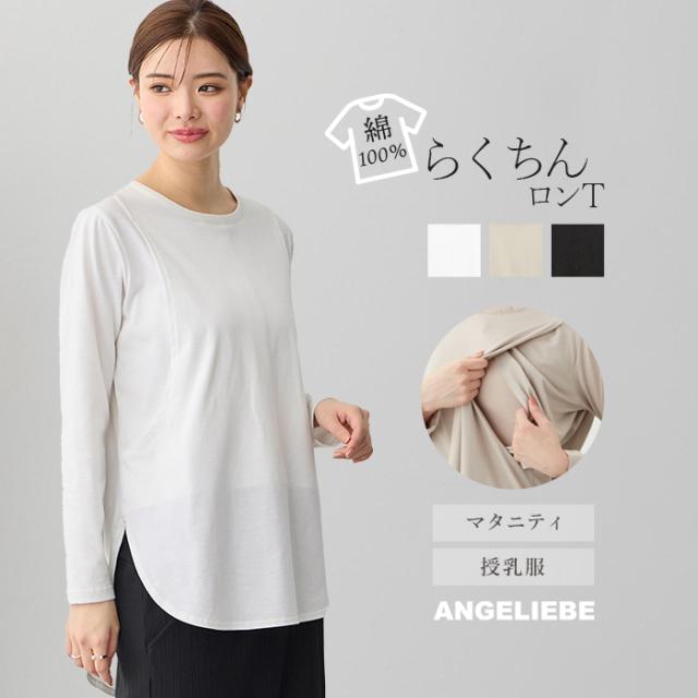 1枚で着たりニットのインに合わせたりと、毎日のコーディネートに大活躍。色違いで揃えたくなるシンプルなロングTシャツです。両サイドに授乳口がついているので、赤ちゃんを待たせることなくサッと授乳できて便利。やや長めの着丈で、裾がシャツテールになっているのもポイントです。
