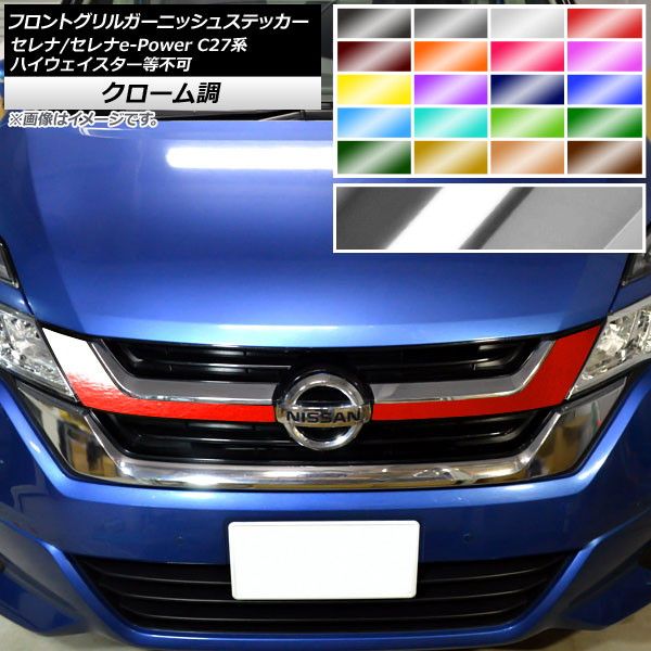 フロントグリルガーニッシュステッカー セレナ/セレナe-Power C27系 ハイウェイスター等不可 クローム調 選べる20カラー AP-CRM3974 入数:1セット(2枚)