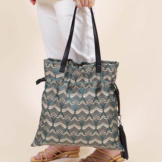 ジャガード素材の総柄デザインが高級感を演出してくれる、華やかなトートバッグ。