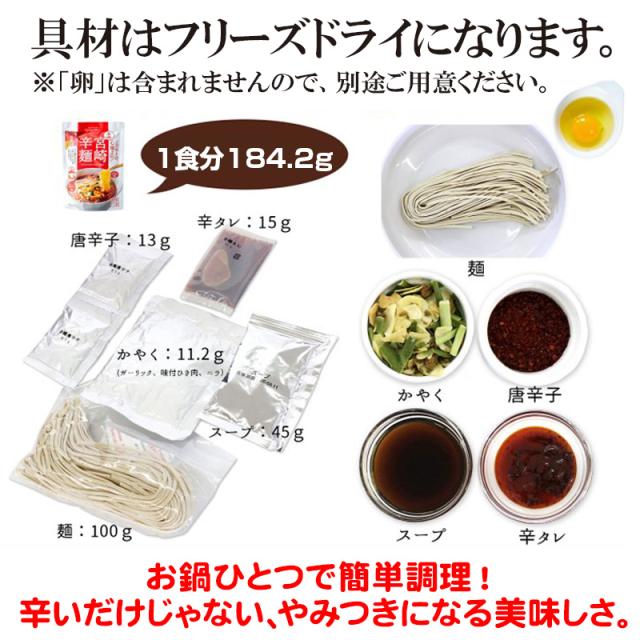 - 宮崎辛麺の中では一番好きです。少し高めだけど、卵入れて満腹感もあるので定期的に購入してます。余った唐辛子はふりかけにしたり、焼き鳥にかけると良いです。辛いのはかなり好きだけど、あの唐辛子袋は結局使わな...