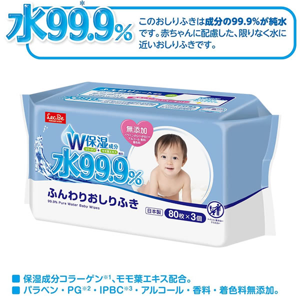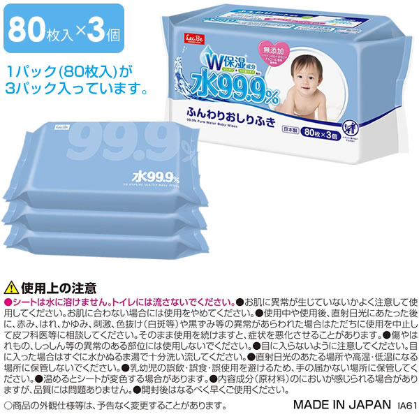 おしり拭き 水99.9% ふんわりおしりふき 80枚×3個入 E90564 | 赤ちゃん ベビー ウェットシート お尻 拭く パラベンフリー アルコールフリー 日本製 肌にやさしい ソフト やわらかい パッチテスト済