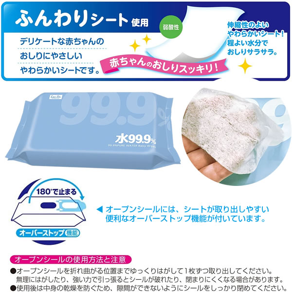 成分の99.9%が純水このおしりふきは成分の99.9%が不純物を取り除いた純水。赤ちゃんに配慮した、限りなく水に近いおしりふきです。