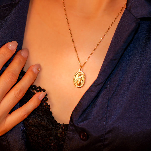 【ボヘミアンリゾート】ボヘミアンスタイルを通し、ジプシーのように習俗に捉われない、自由奔放な生き方そのもの”と言う意味を表現しました。美しいマリアのディテールと厚みのっかりとしたボヘミアンリゾート仕様になります。マリアの周りには“O Marie. concue sans peche priez pour nous qui avons recours a vous.(原罪無くして宿り給いし聖マリア、御身に寄り頼み奉るわれらにのために祈り給え)が刻まれており、裏面には、12の星の輪と十字架の上に乗る大きなMの文字、茨に囲まれた王冠を冠したイエス・キリストの心臓と王冠を冠し剣の刺さった聖母マリアの心臓が彫り込まれています。