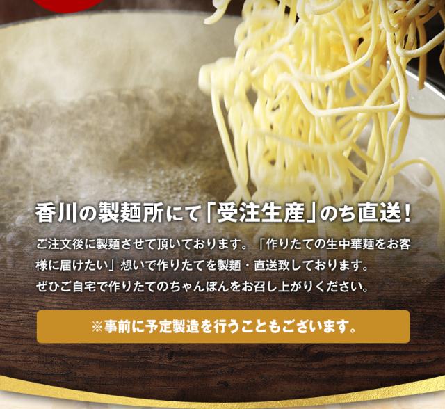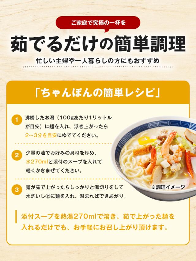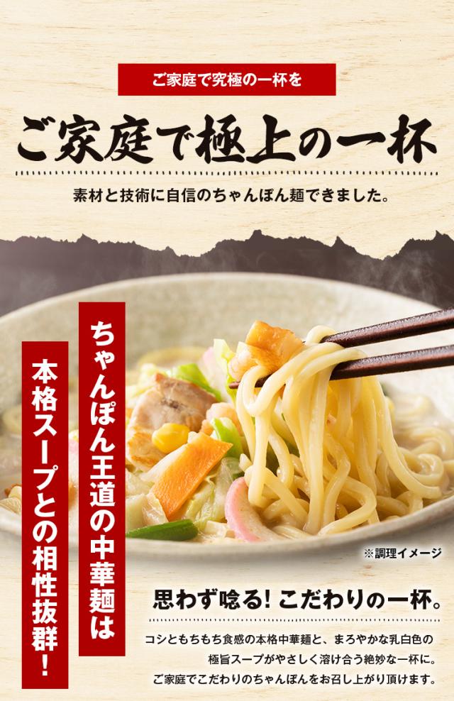 - 届いて、とてもおいしかったのでリピート注文しました。お店のちゃんぽんを食べているようなおいしい麺が家で食べられる。注文してからの配送なので届くのは遅いが、気にならない。