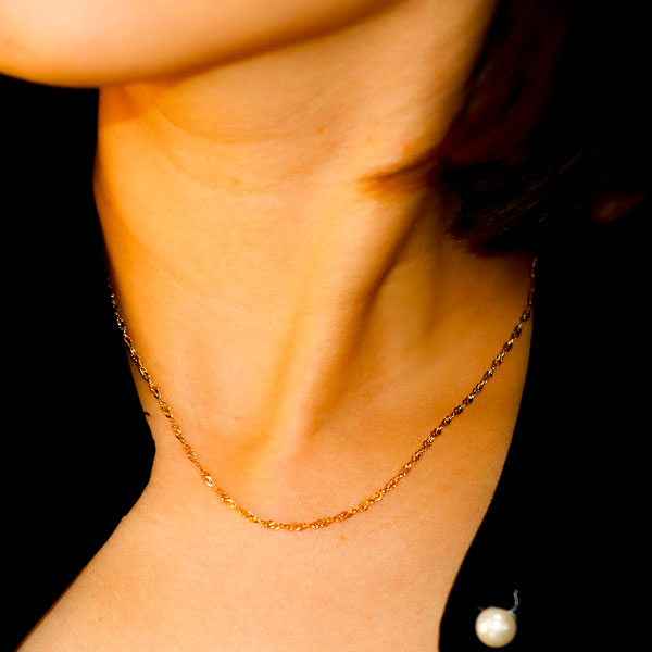 両手でチェーン左右端を持って頂き片方だけネジります。好みのネジれ具合になりましたらそのまま首に装着してください。お好みのネジれ具合で解けることはなく着用して頂けます。