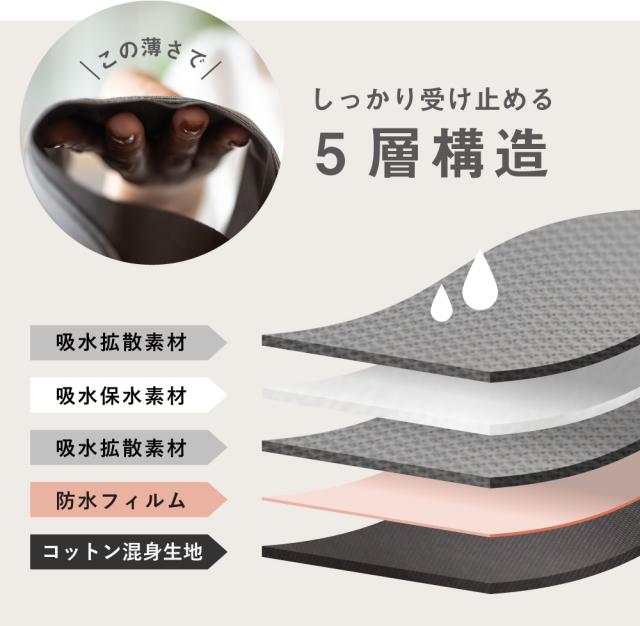 “気にならない”ための5層構造。 安心感があって、かつ快適な着心地を作る吸水部分は、薄さに見合わぬ5層構造。 履きっぱなしでもすぐにさらり。 ひんやり、ジワっとした感覚が戻ってこないように、一度吸ったら水分を手放しにくい保水素材を使用。
