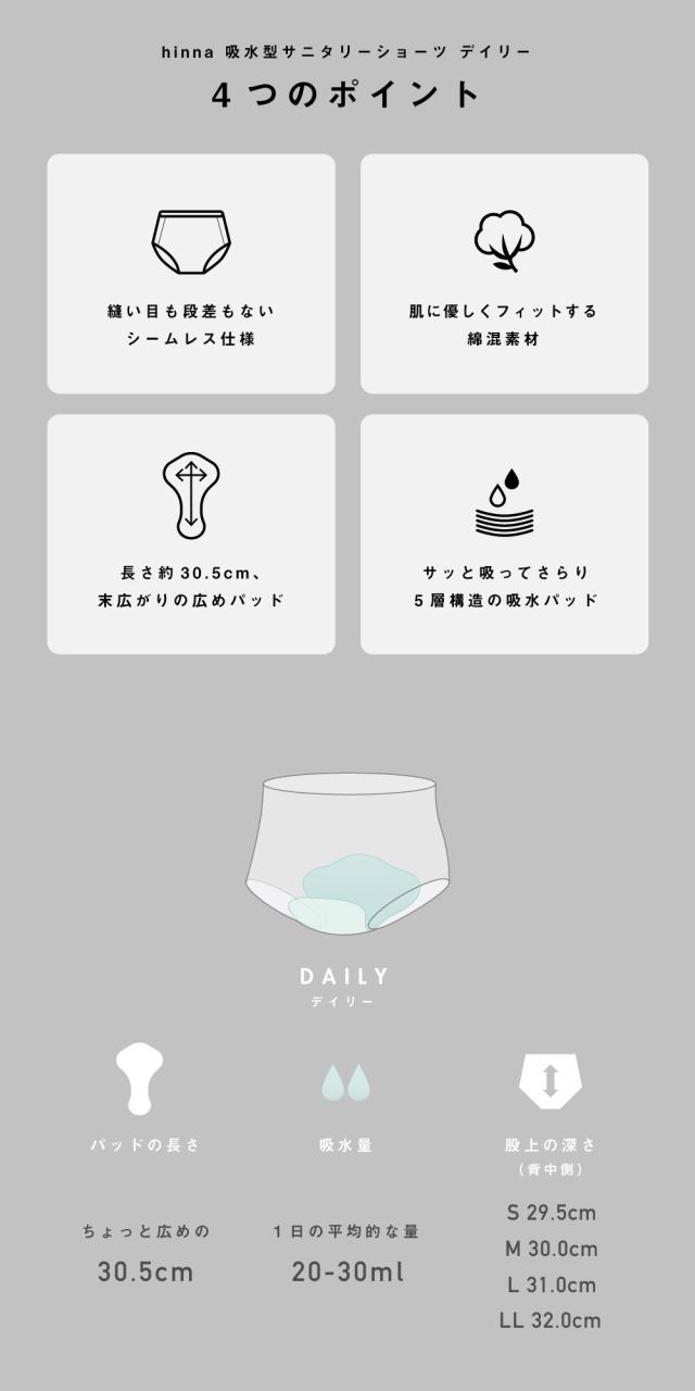 hinna 吸水ショーツ サニタリーショーツ 20ml 30ml 生理 フェムテック シームレス 綿混 コットン サニタリー 尿もれ 蒸れにくい 昼用 | ヒンナ 吸水型サニタリーショーツ デイリー ts1031