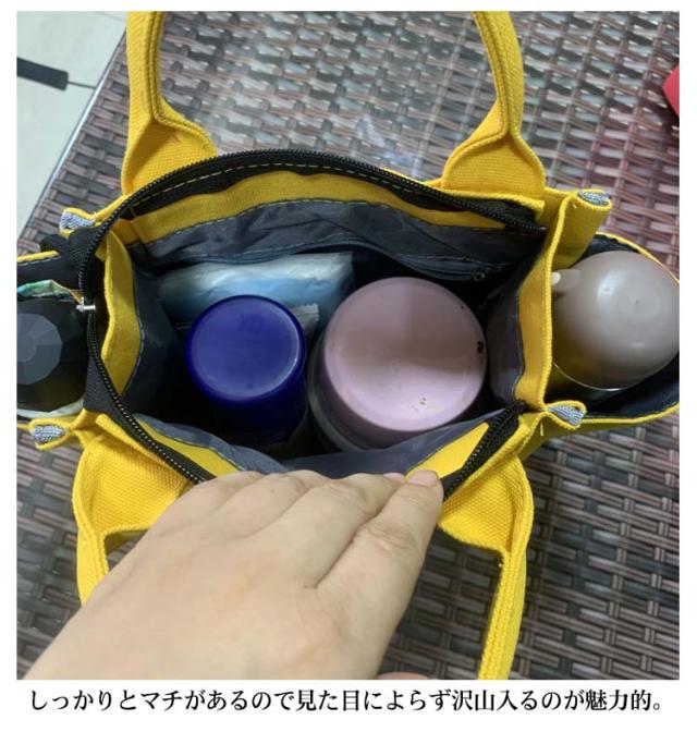 | デイリーからお出かけまで幅広く使えるのが嬉しいミニトートバッグ。 仕切りがあるので荷物を綺麗に整理整頓して入れられます。 大きめのポーチやランチボックスも入るメイン収納部分など見た目以上の収納力と機能性。 ペットボトルを入れるのに便利な縦型収納。 通勤、通学やお出かけなどに使いやすいサイズ感なので、年齢問わず使えるバッグです。 | |