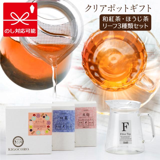 きごころ クリアポットと 和紅茶 ・ ほうじ茶 ギフト(紅麗・米麹・八女ほうじ茶) リーフタイプ 紅茶 国産紅茶 熨斗 のし 無添加 贈答用