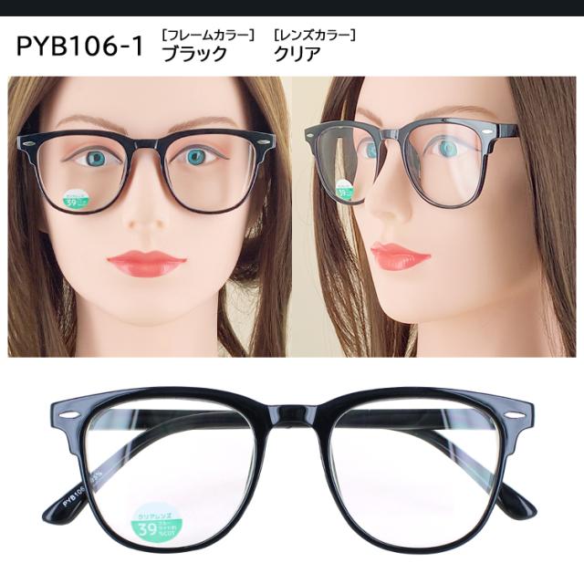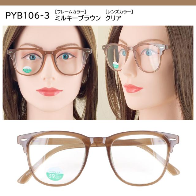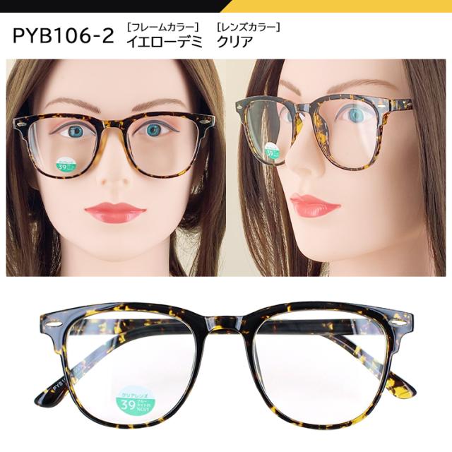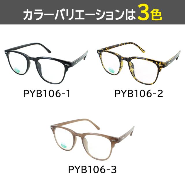 | ●フレームカラー PYB106-1 ブラック PYB106-2 イエローデミ PYB106-3 ミルキーブラウン ●レンズカラー(全色共通) クリア | ●素材 フレーム:プラスチック テンプル:プラスチック レンズ:プラスチック ●仕様 ブルーライト約39%カット UVカット99%以上 |