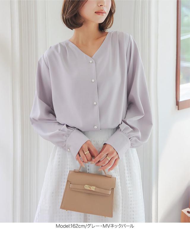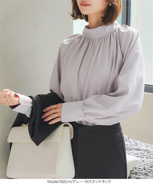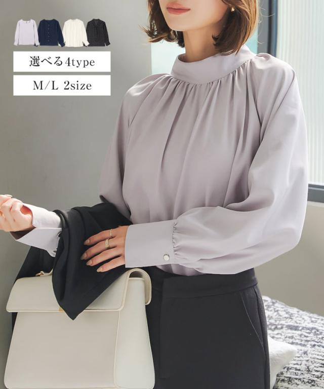 春新作 選べる4タイプ デザインブラウス C6409 入荷済 レディース トップス シャツ オフィス Vネック スクエアネック スタンドネック ボタン ゴールド エレガント スタンドカラー ギャザー タック シフォン 秋 スーツ セットアップ 洗える