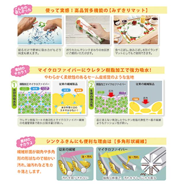 | 商品説明 | ・水分を素早く吸水!毎日の食器洗い後に便利な水切りマットが発売。 ・ウレタン樹脂加工を施した、マイクロファイバー素材を採用!吸水性に優れた水切りマット。 ・絞ると吸水力が復活! ・クッション性もあり、大切な食器にやさしくフィット! ・マイクロファイバーの超極細繊維で、細かな汚れを落とせるのもポイント。 ・生地に抗菌加工を施しているから、いつも清潔◎ ・汚れたら石けんなどで軽く揉み洗いし、乾かして繰り返し使えるのが嬉しい♪ ・食べこぼしや飲みこぼしを防ぐランチマット、折りたたんでシンクまわりやテーブルの台拭きとして使ってもOK。 ・安心の日本製。洗い替え用にデザイン違いで揃えるのもおすすめ。(※種類によりパッケージが異なりますが、仕様などは同じです。) |