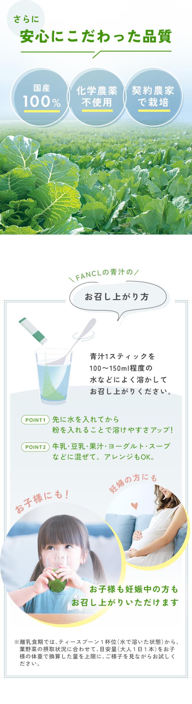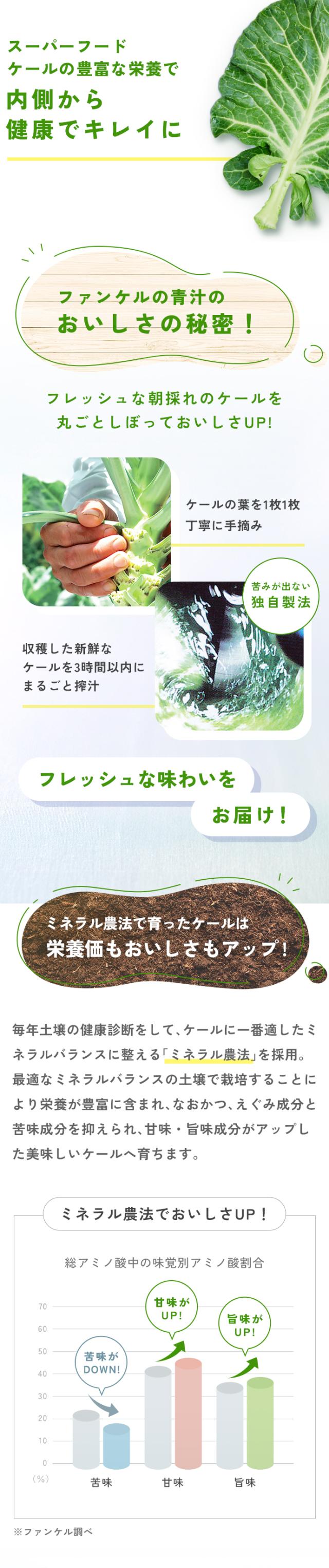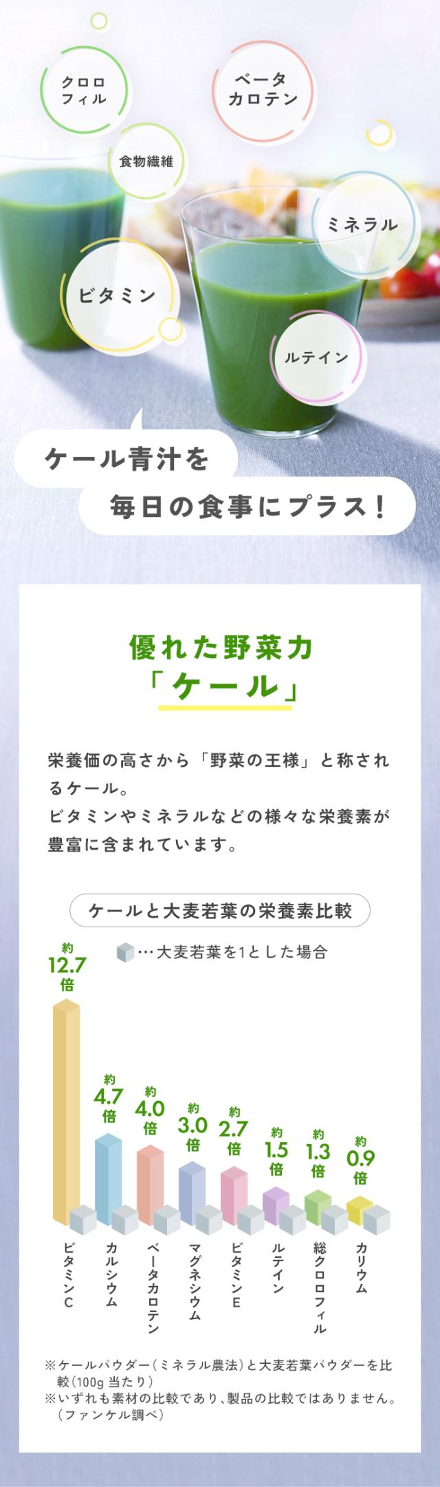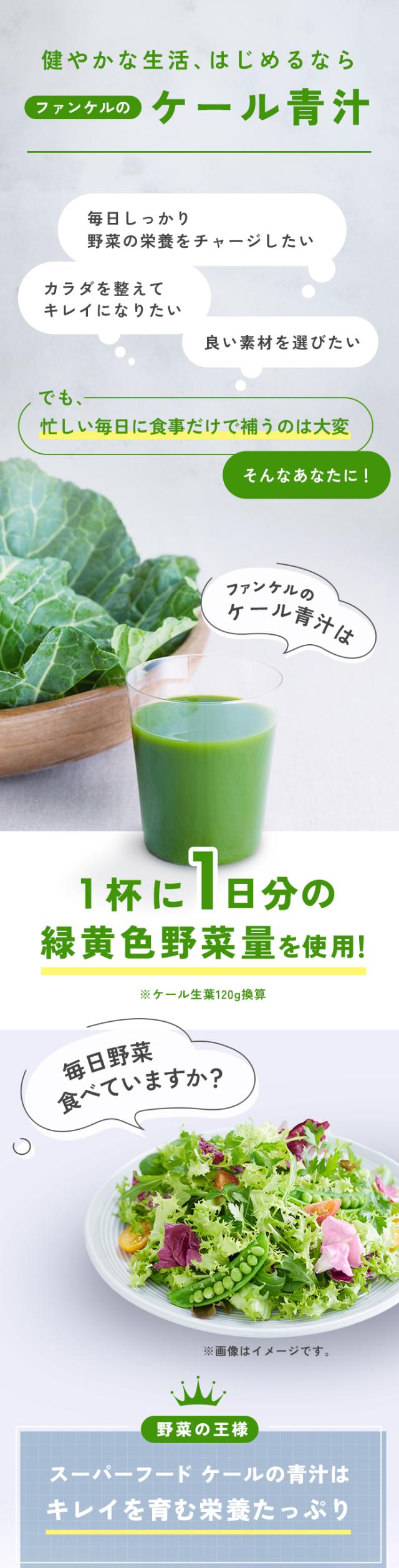 1杯に1日分の緑黄色野菜量、ケール生葉120g使用。契約農家で大切に育てられた国産ケールの野菜力がギュッと詰まった青汁です。ファンケル独自製法で溶けやすく、サラッとしたのどごし。緑黄色野菜をしっかりととりたい方におすすめです。