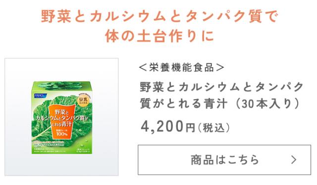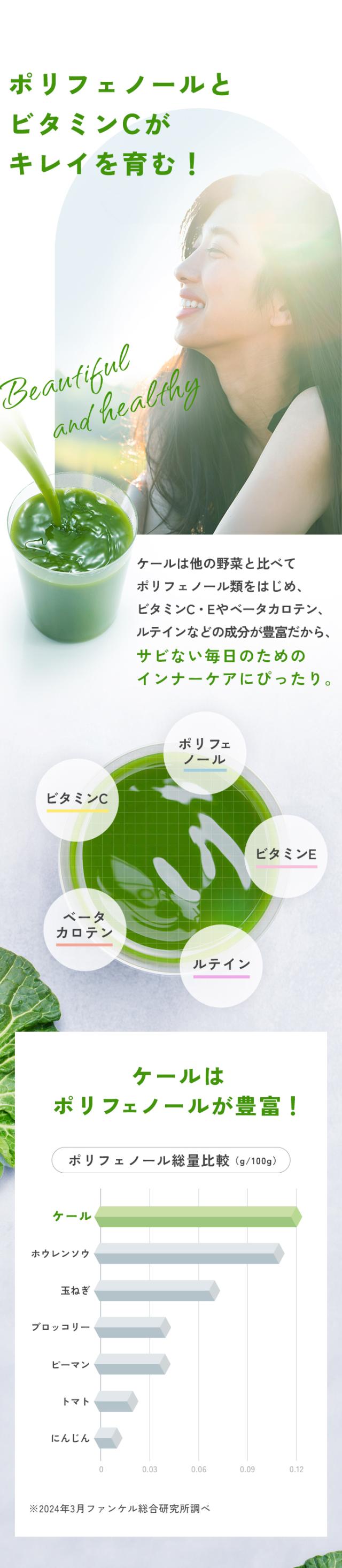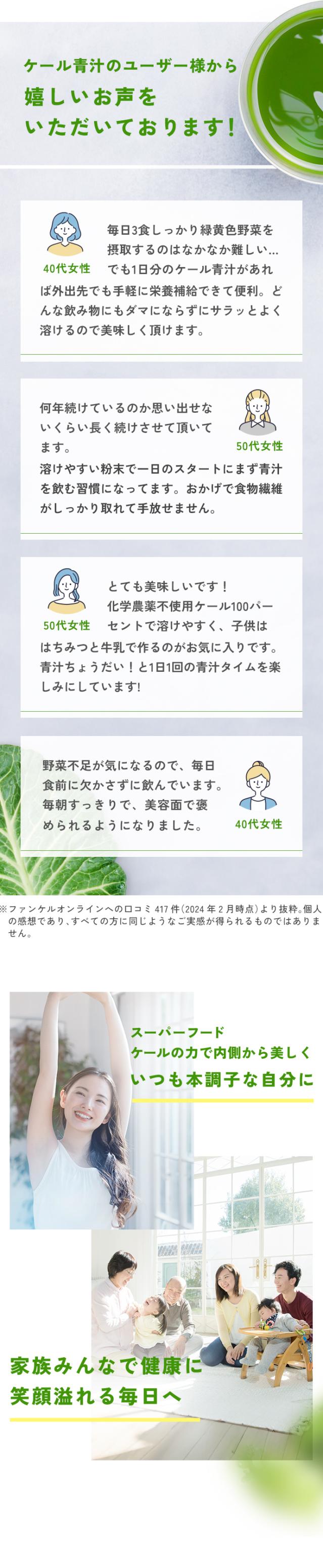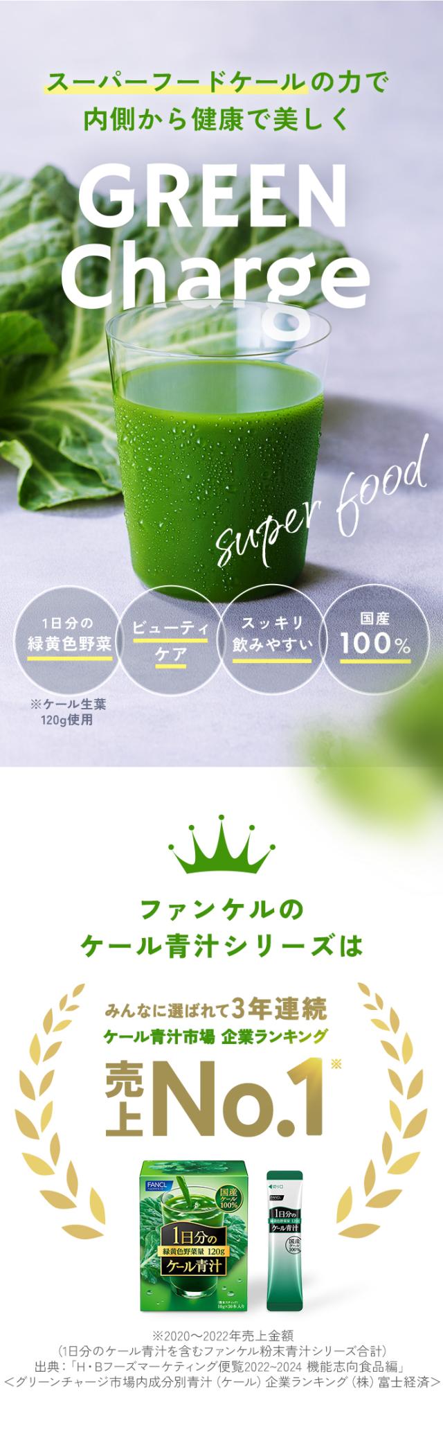 1杯に1日分の緑黄色野菜量、ケール生葉120g使用。契約農家で大切に育てられた国産ケールの野菜力がギュッと詰まった青汁です。ファンケル独自製法で溶けやすく、サラッとしたのどごし。緑黄色野菜をしっかりととりたい方におすすめです。