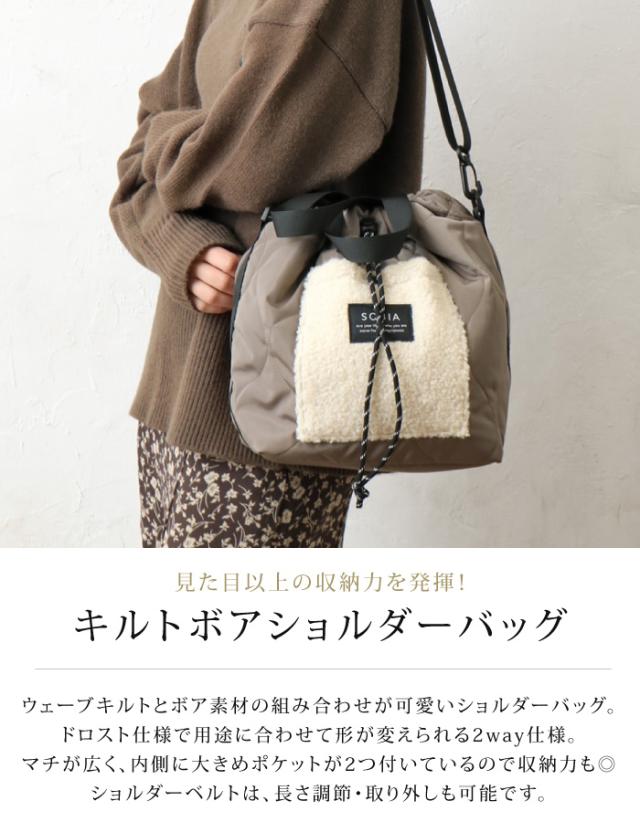 ウェーブキルトとボア素材の組み合わせが可愛いショルダーバッグ。 ドロスト仕様で用途に合わせて形が変えられる2way仕様。 マチが広く、内側に大きめポケットが2つ付いているので収納力も◎ ショルダーベルトは長さ調節・取り外しも可能です。