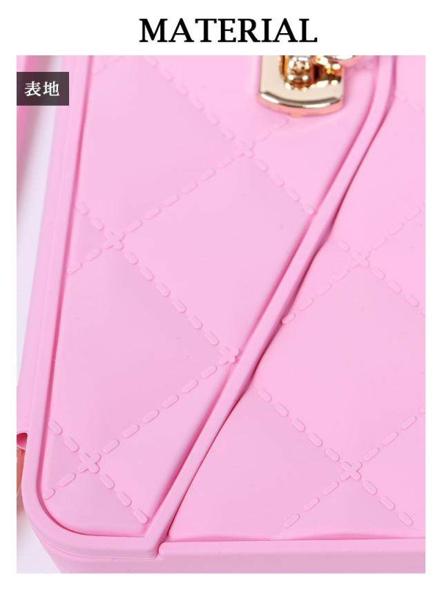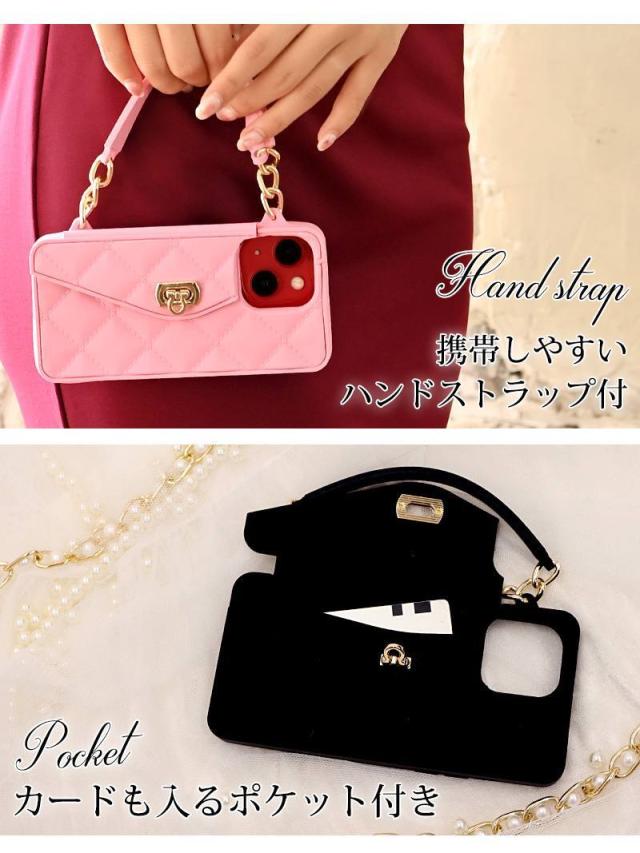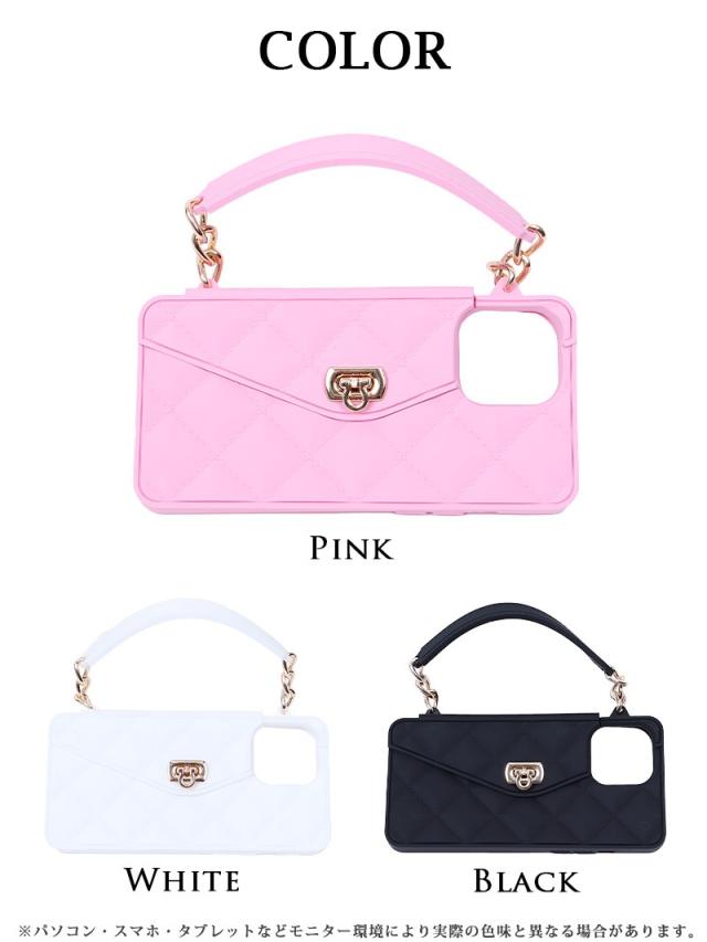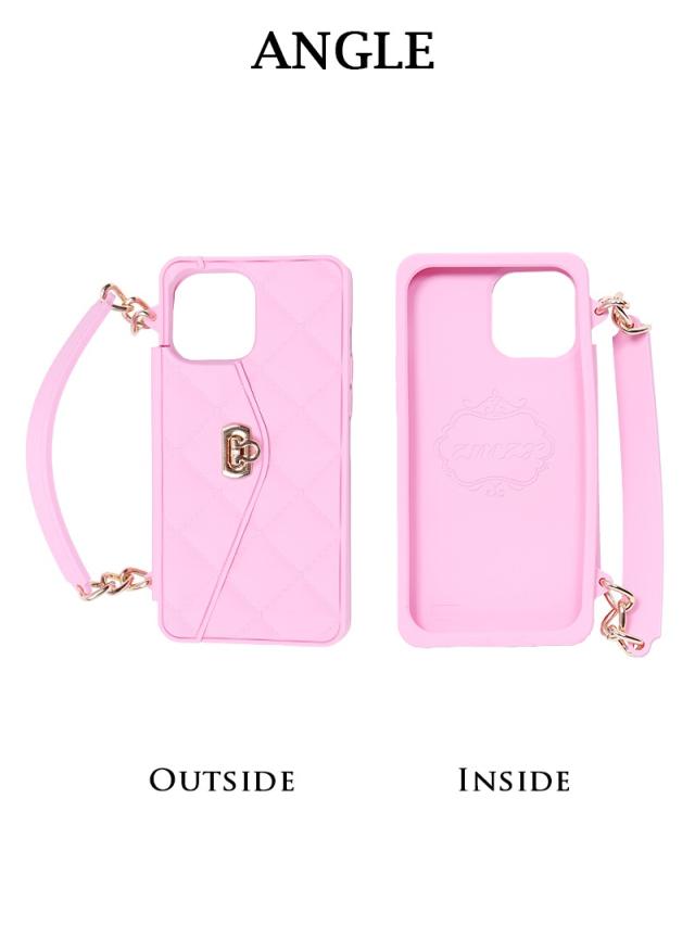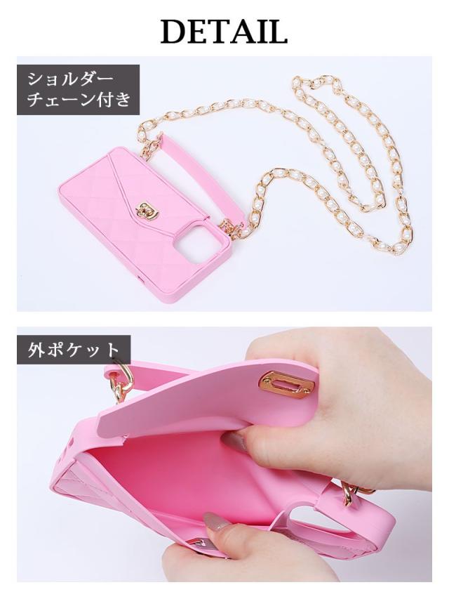 ☆立体感のあるキルティング調デザインとカードや小銭を収納することのできるポケットをあしらったシリコンスマホケースにはサッと手持ち出来ちゃう取っ手付きなのも嬉しいポイント!また取り外し可能な肩掛けできるショルダーストラップもついた多機能なスマホショルダーです♪