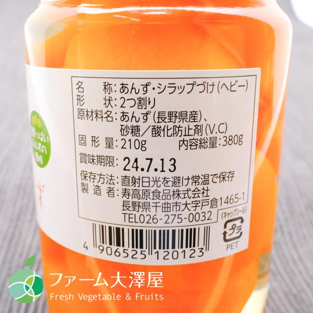 〇名称:あんず・シラップづけ(ヘビー)〇形状:2つ割り〇原材料名:あんず(長野県産)、砂糖/酸化防止剤(V.C)〇固形量:210g〇内容総量:380g〇保存方法:直射日光を避け常温で保存