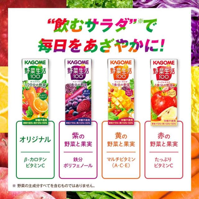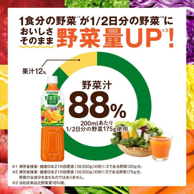 200ml当たり1/2日分の野菜(※)を使用し、野菜汁88%+果汁12%=100%。