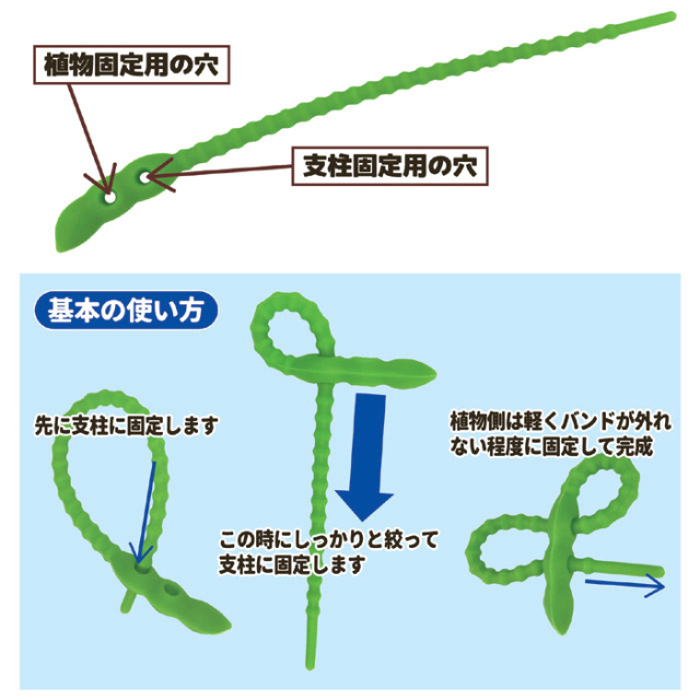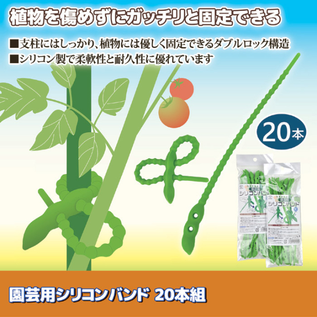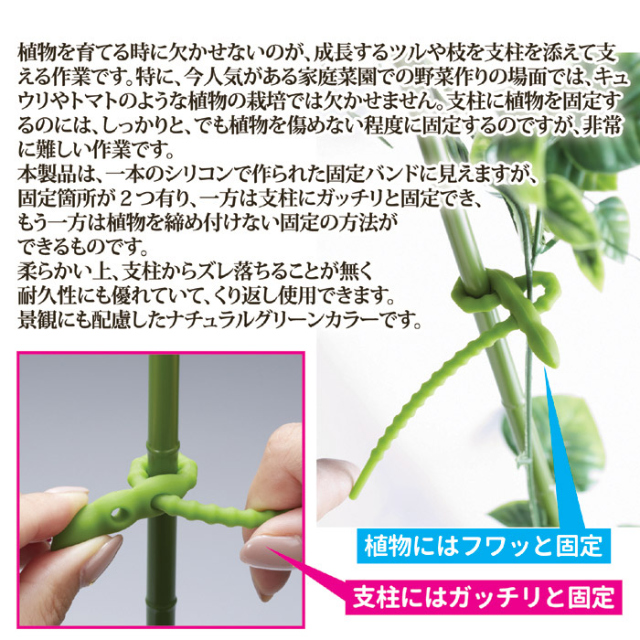 植物を傷めずにガッチリと固定できる!●支柱にはしっかり、植物には優しく固定できるダブルロック構造●シリコン製で柔軟性と耐久性に優れています●植物を育てる時に欠かせないのが、成長するツルや枝を支柱を添えて支える作業です。●特に、今人気がある家庭菜園での野菜作りの場面では、キュウリやトマトのような植物の栽培では欠かせません。●支柱に植物を固定するのには、しっかりと、でも植物を傷めない程度に固定するのですが、非常に難しい作業です。●本製品は、一本のシリコンで作られた固定バンドに見えますが、固定箇所が2つ有り、一方は支柱にガッチリと固定でき、もう一方は植物を締め付けない固定の方法ができるものです。●柔らかい上、支柱からズレ落ちることが無く耐久性にも優れていて、くり返し使用できます。●景観にも配慮したナチュラルグリーンカラーです。