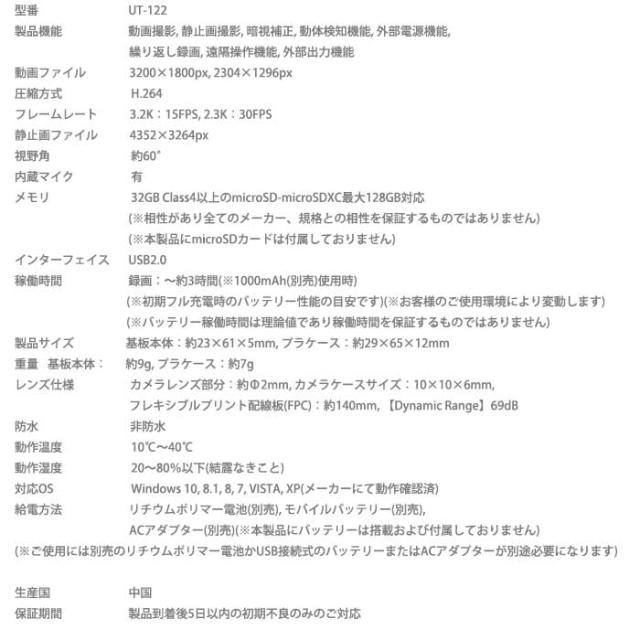 ■ 3.2K 小型カメラ基板完成実用ユニット スパイダーズX PRO (UT-122)スペック
