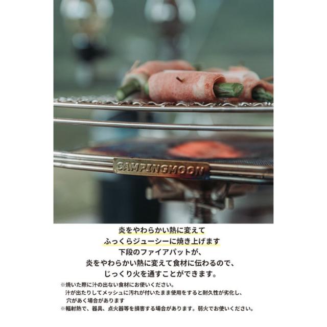 下段の特殊耐熱メッシュが、炎をやわらかい熱に変えて食材に伝わるので、じっくり火を通すことができます。