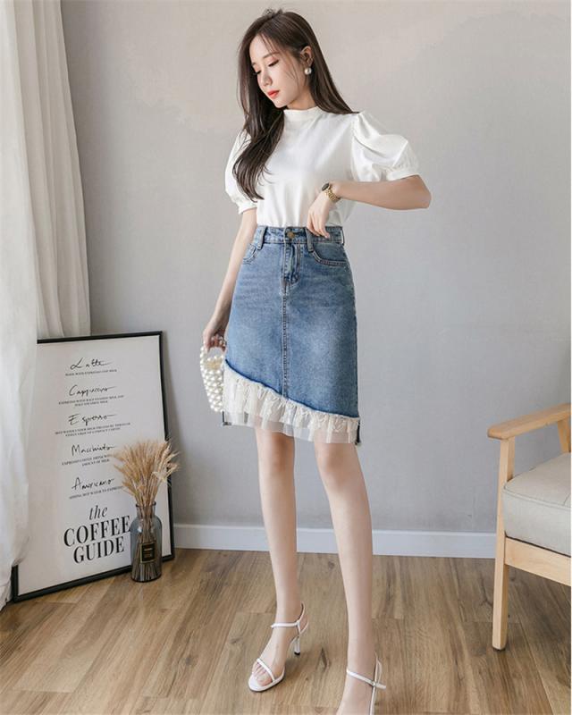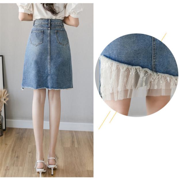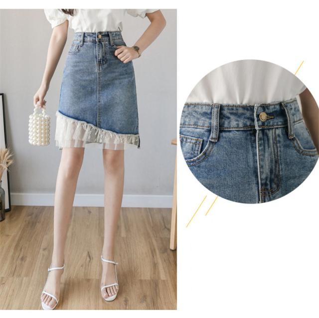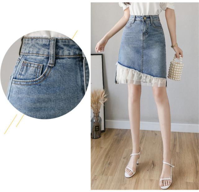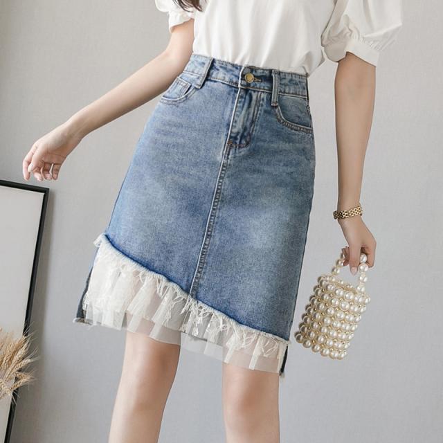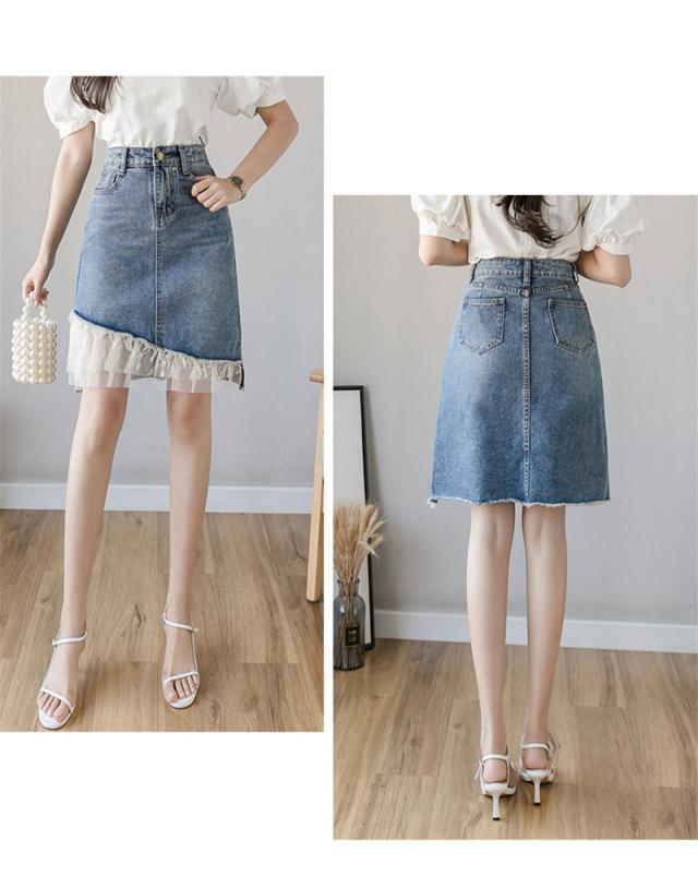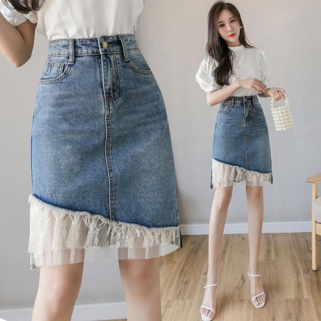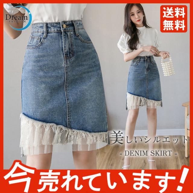 デニムスカート レディース スカート ボトムス ハイウエスト レース デニム 異素材 ダメージ加工 イレギュラー おしゃれ 日常感