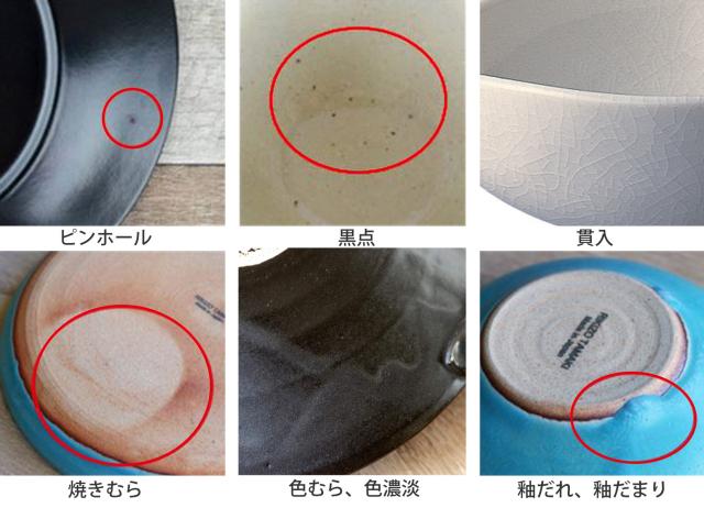 原料や製造方法により、上記のような特性がみられる場合があります。ひとつひとつのうつわの持つ個性、温かみある風合いとしてお楽しみいただければ幸いです。