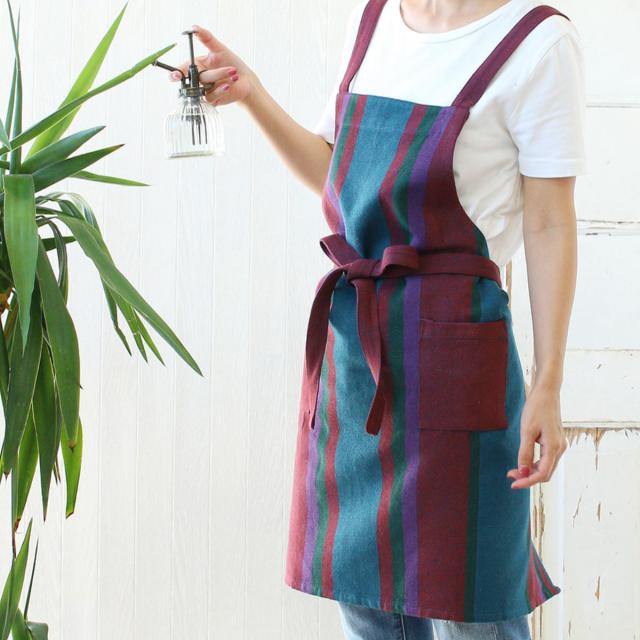 元気が出るカラーの縞模様が個性的で楽しい、ラヤシリーズのエプロンです。個性的だけどくどくない、日常に溶け込むデザインが魅力で、お料理や家事にはもちろん、ちょっとしたガーデニングの際にも活躍します。
