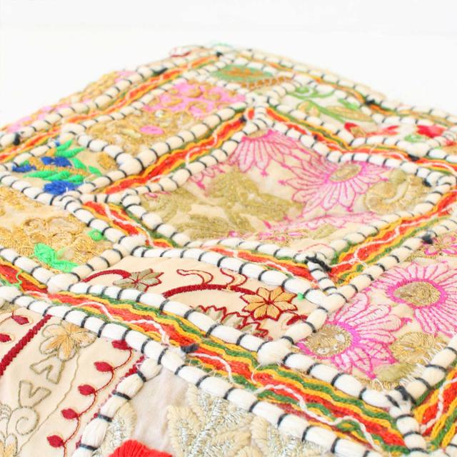 北インドに伝わるカンバディアパッチワークです。サリーやクルタなど、華やかな刺繍やビーズが施された伝統衣装の希少なヴィンテージ布をひとつひとつ手でつなぎ合わせたチェアパッドです。
