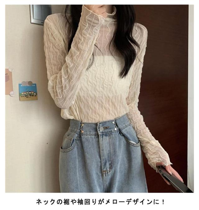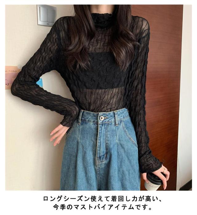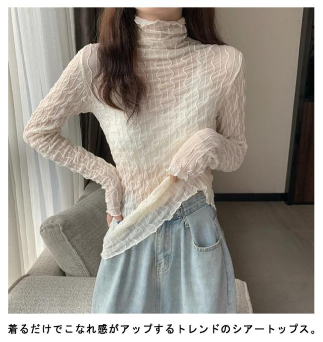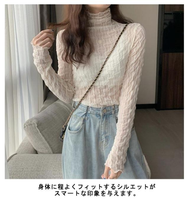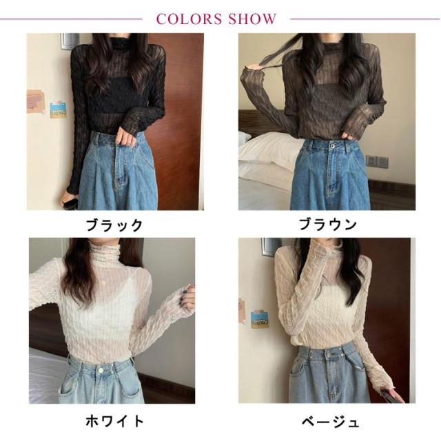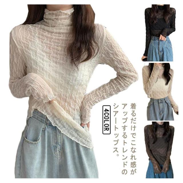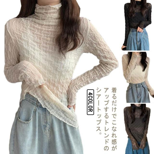 カットソー レディース シースルー レース 長袖 透け タートルネック レイヤード 重ね着 着回し シアーブラウス 薄手 フリーサイズ 春 秋 全4色