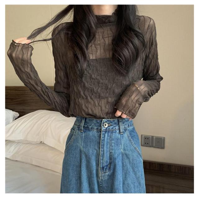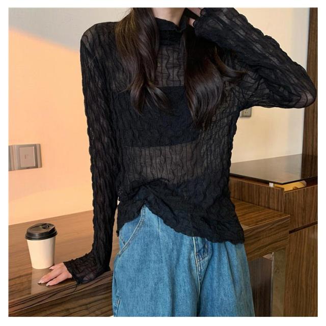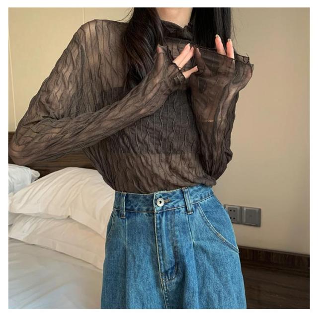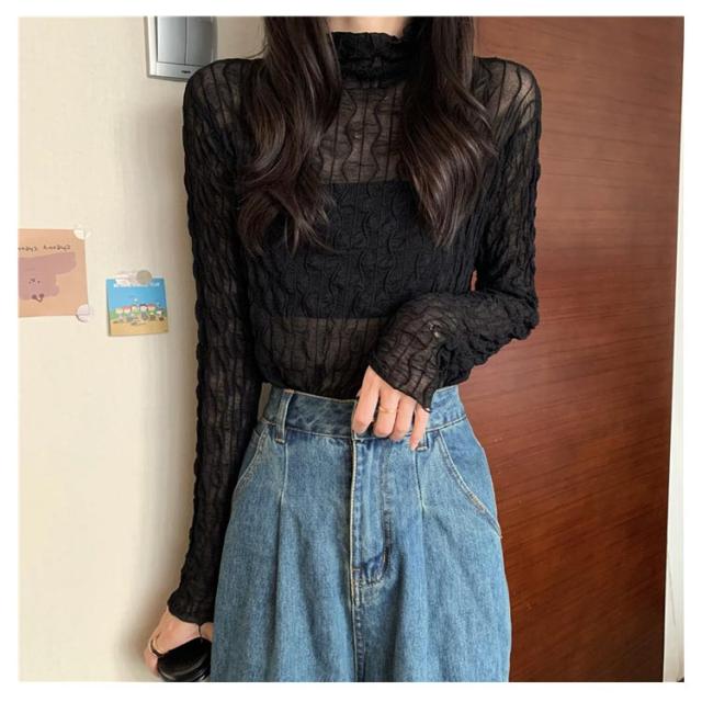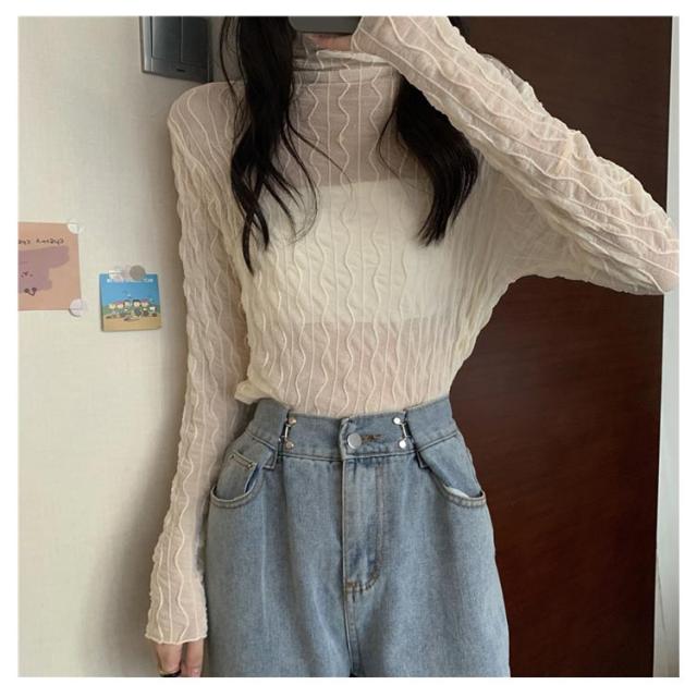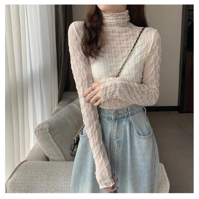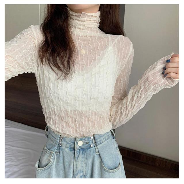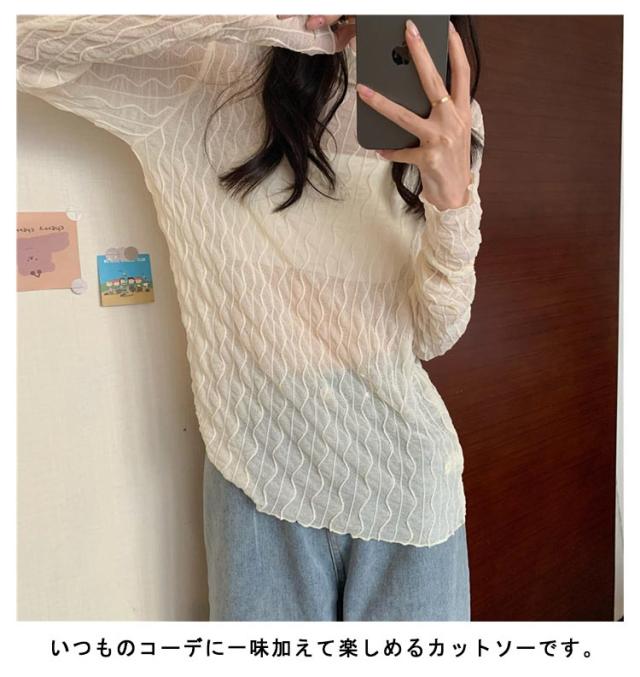 カットソー レディース シースルー レース 長袖 透け タートルネック レイヤード 重ね着 着回し シアーブラウス 薄手 フリーサイズ 春 秋 全4色