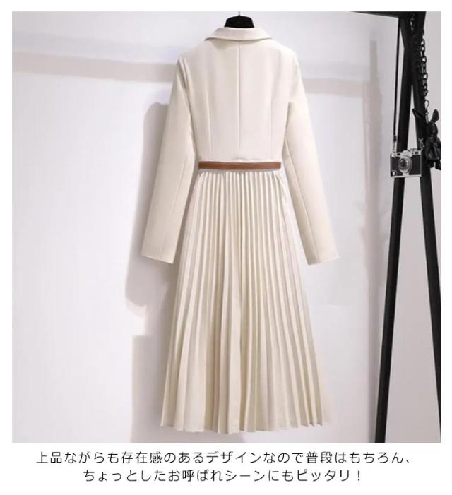 | テーラードジャケットとプリーツスカートが一体になったのスーツワンピース。 揺れるプリーツが清楚感漂うきれいめワンピース。 ロング丈ワンピースは結婚式やセレモニーでも着回しがしやすいフレアシルエット。 ボリュームのあるシルエットで体型カバーをしつつ、大人上品な印象に。 付属のベルトを絞ってメリハリをつけ脚長効果もバツグン。 上品ながらも存在感のあるデザインなので普段はもちろん、ちょっとしたお呼ばれシーンにもピッタリ! | |